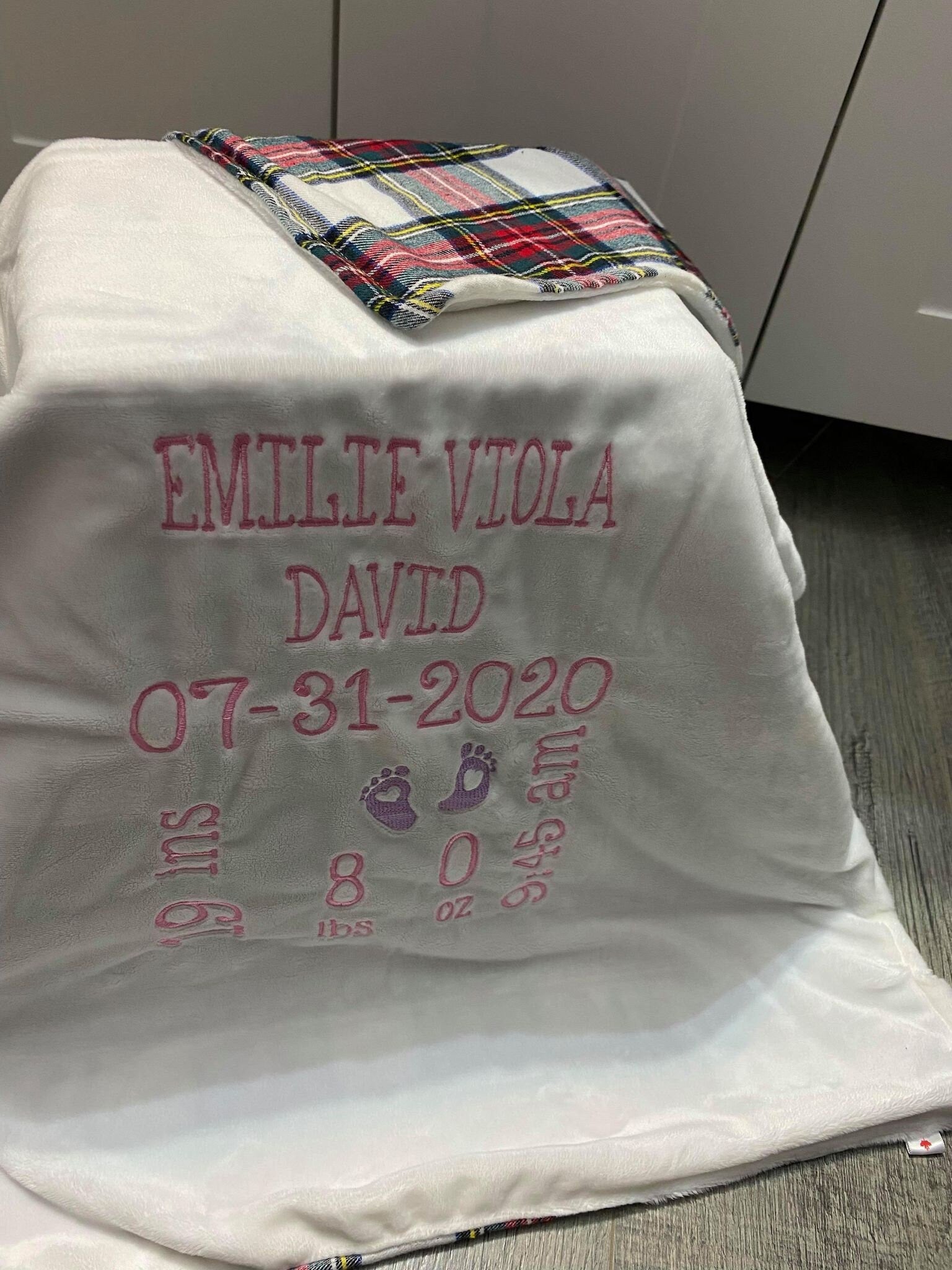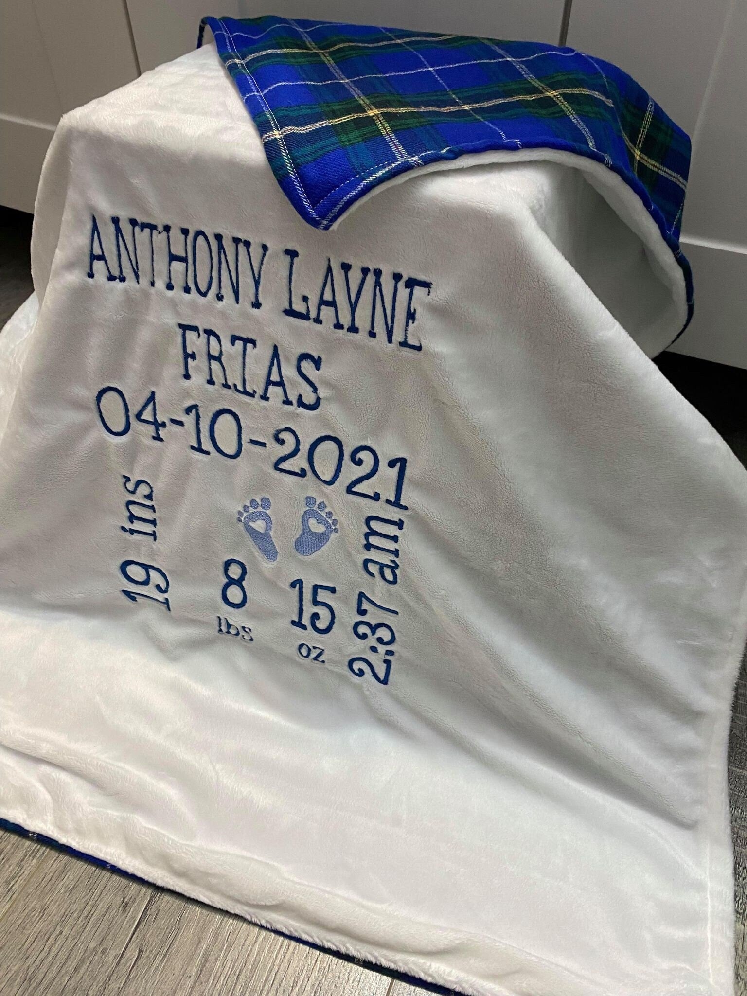 These personalized stroller size blankets are the perfect gift to welcome your newest bundle of joy home. Made from a quality chenille on the top, and flannel on the back, these blankets are embroidered with your baby's birth stats in a thread colour of your choice. These blankets measure 30"x30".