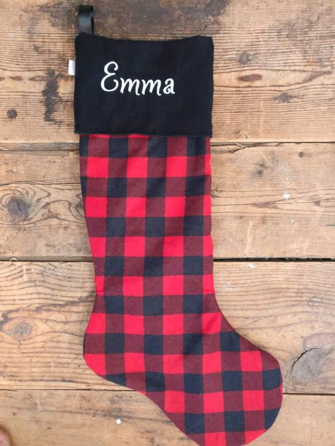 Our Plaid Christmas Stockings are made-to-order with a plaid-print outer fabric and a solid colour liner/cuff. They measure approximately 22" long by 7.5" wide.