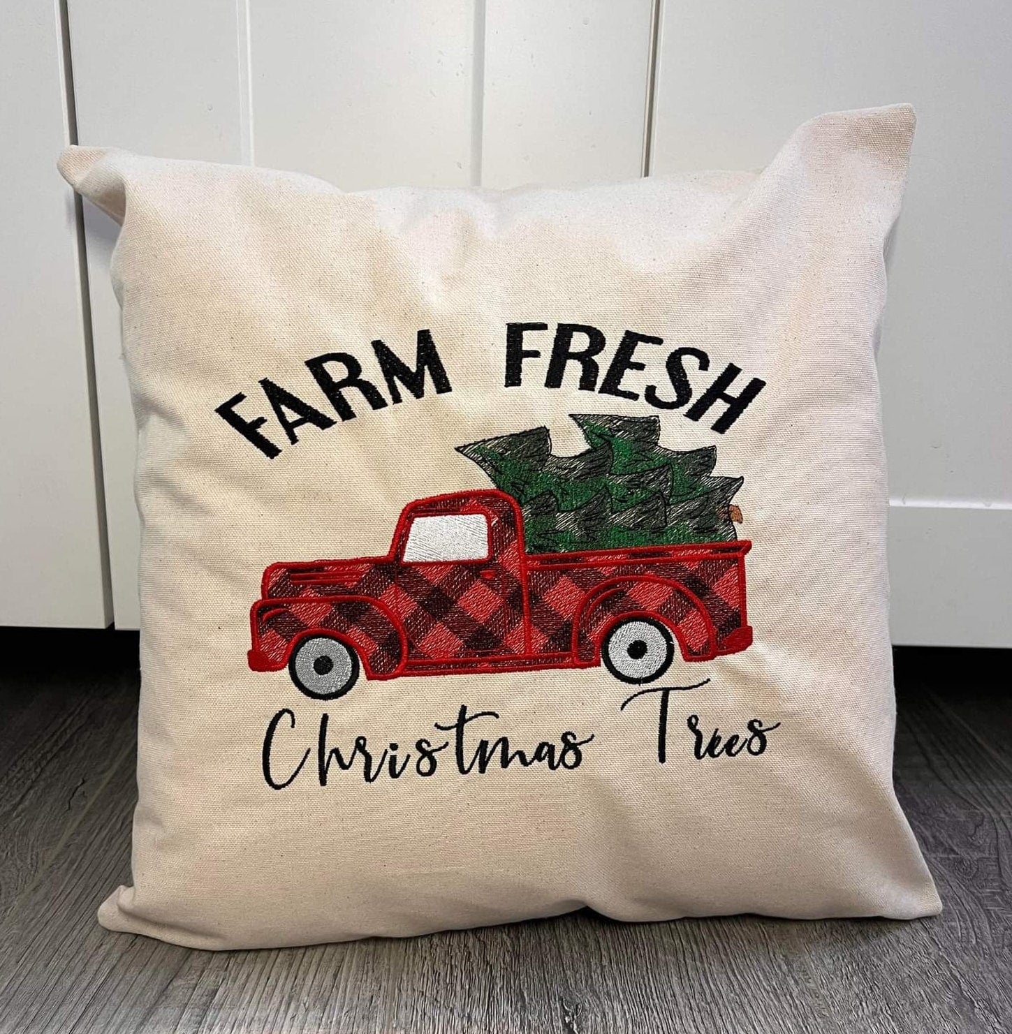 All of our cushion covers are made-to-order. The covers are made of a medium-weight canvas, have a zipper closure and measure approximately 18"x18".