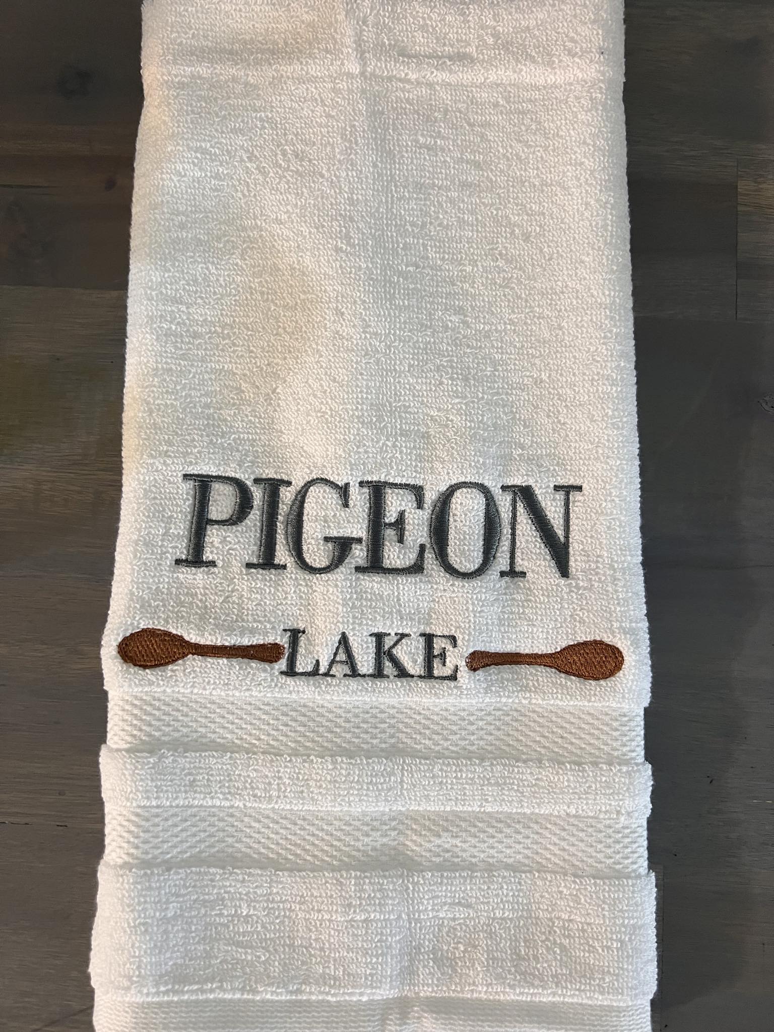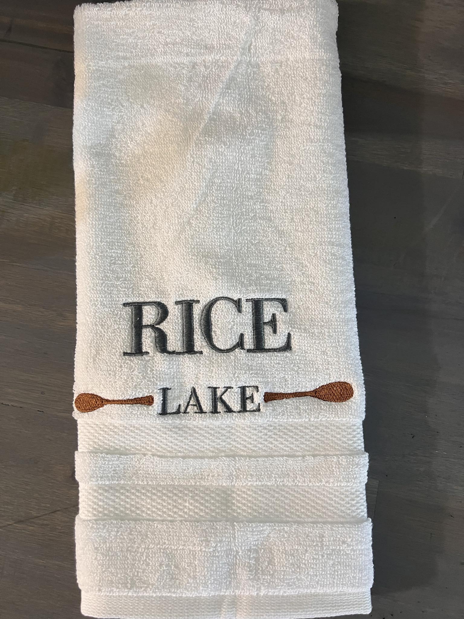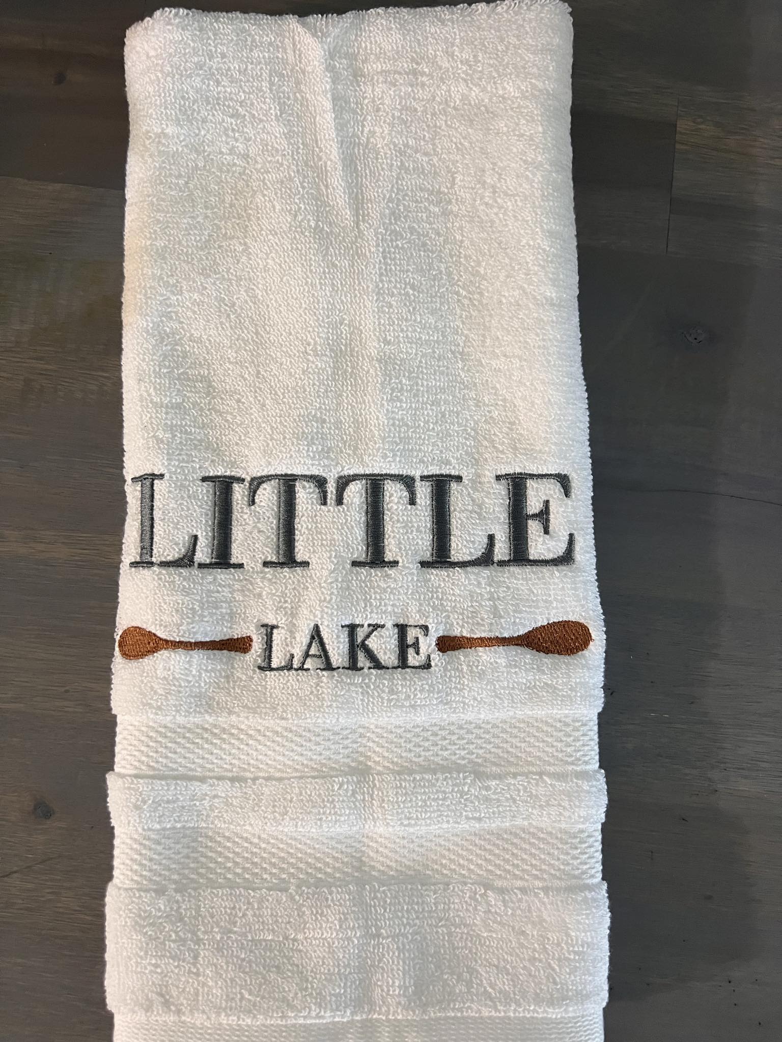 Any lake or city name can be embroidered onto these high quality hand towels.