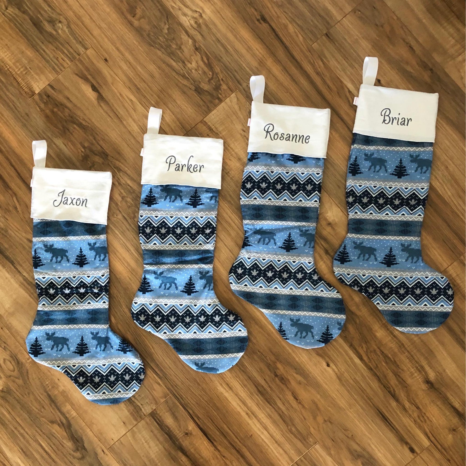 Our Moose Christmas Stockings are made-to-order with a moose-print outer fabric and a solid colour liner/cuff. They measure approximately 22" long by 7.5" wide.