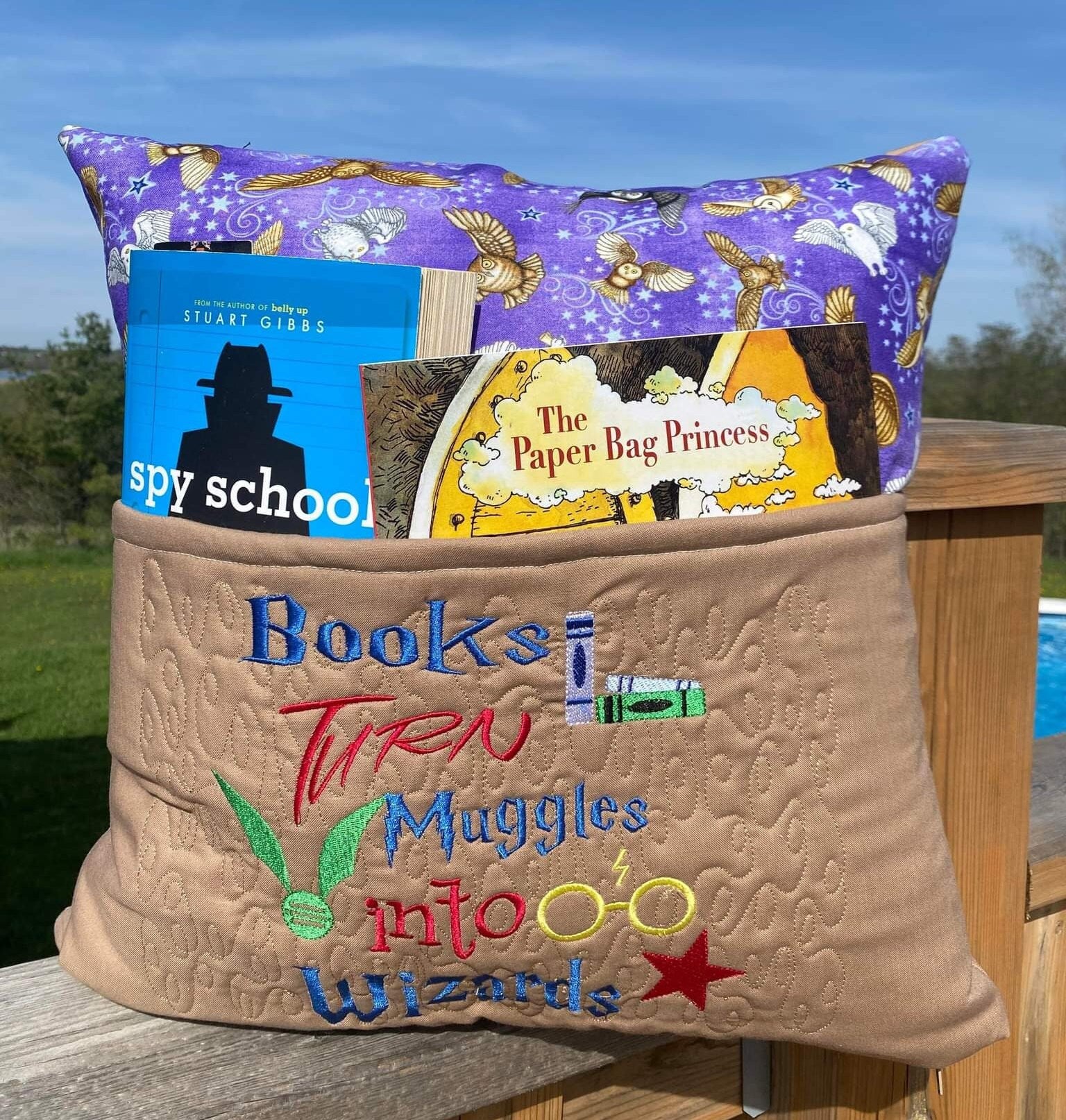 These embroidered reading pillows are the perfect gift for kids or adults. Each one is handmade with quality in mind. Our covers measure approximately 18"x18" and have a pocket in the front to store a book or magazine.